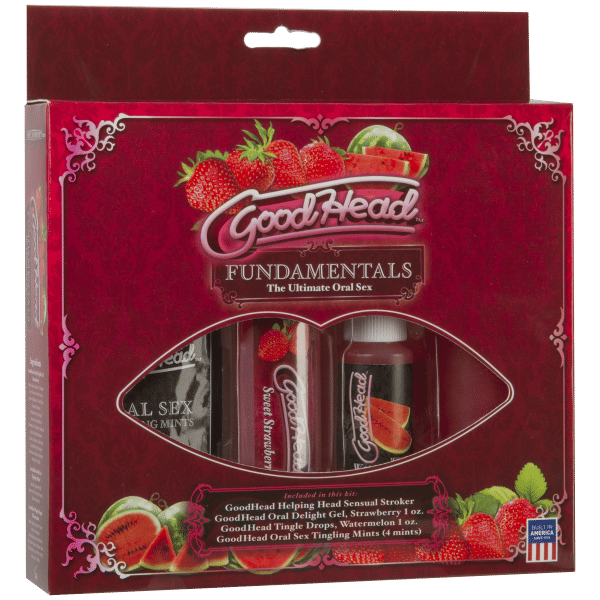 GoodHead Fundamentals provides everything you need for wonderful oral pleasure, time after time. The Sweet Strawberry flavored GoodHead Oral Delight Gel will turn your lover into a sweet strawberry treat, and just a few drops of the delicious Watermelon flavored Tingle Drops will provide the most satisfying blow job experience ever. The Oral Sex Mints offer extra fresh breath and increases the receiver’s sensitivity with a tingling sensation while suppressing the giver’s gag reflex for simply amazing deep throat action! Made from frosted, lifelike Ultra Realistic UR3, the reversible Helping Head Stroker is 2 inches of super soft and stretchy material featuring message beads on the inside to heighten pleasure during fellatio.
